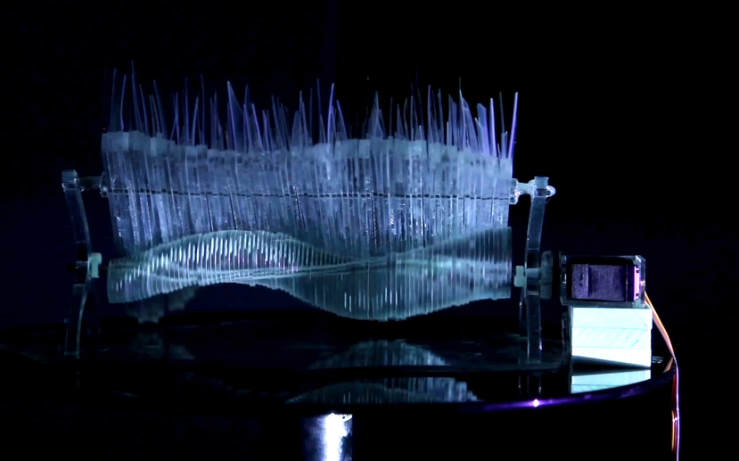 Ever wonder what a structure made of moving glad might look like? Well look no further. “Floe” is one such sculpture, deemed “kinetic glass” and comes from the minds of four artists from the Royal College of Art in London. Lida Marinkova (who has a background in textiles), Ozgun Kilic (who has a background in animation), Oluwaseyi Sosanya (who has a background in design engineering), and Pierre Paslier (a design engineer as well).