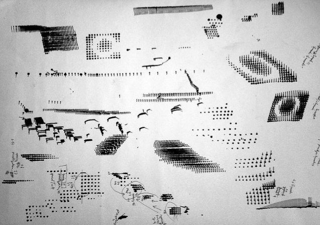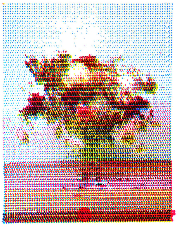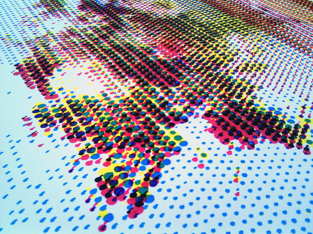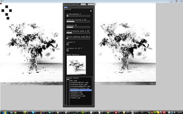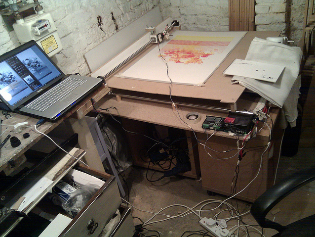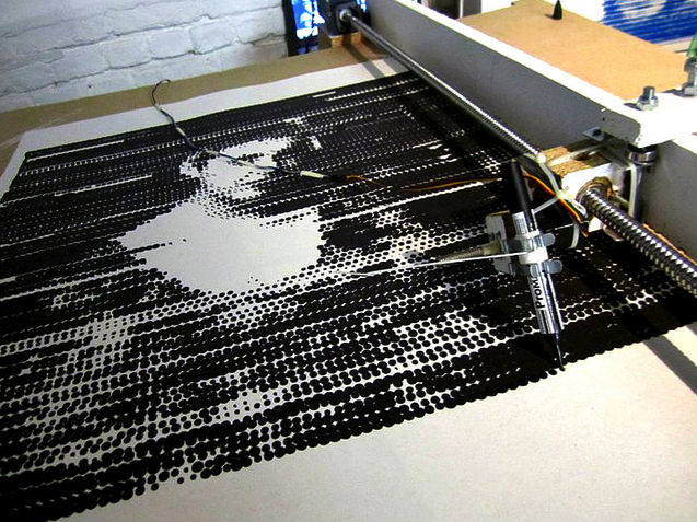 “The time print device uses blotting paper with Letraset felt-pen. The felt-pen ink bleed in the paper for a duration relative to the grey value of a pixel. Every “time stain” gradually recreates any images in a pointilist style. This device was made for my MA project more info at www.convivialtool.com” – Paul Ferragut.